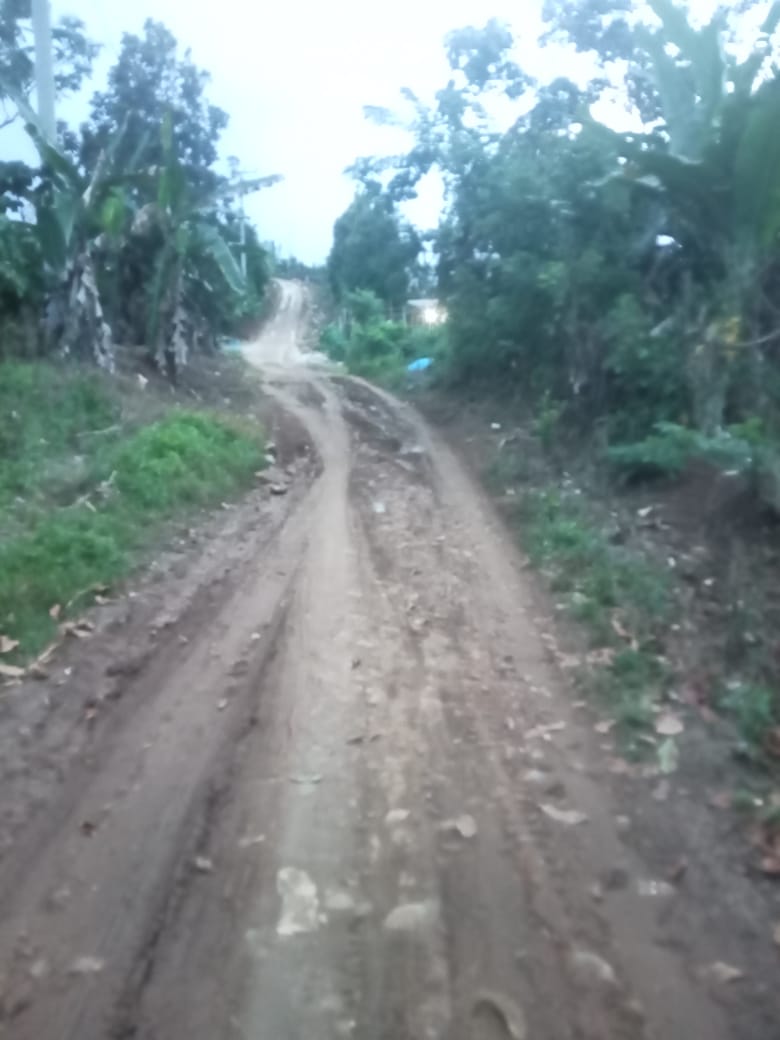 Kondisi jalan berlubang dan becek tersebut menjadi jalur utama warga untuk beraktivitas setiap hari. Ketika musim hujan, genangan air dan lumpur membuat kendaraan sulit melintas dan membahayakan pengguna jalan.
